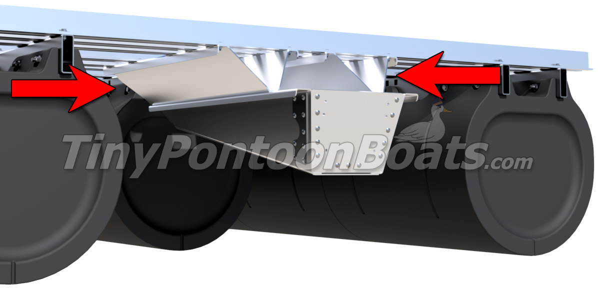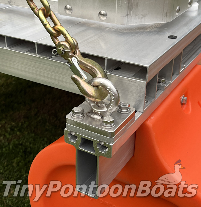 The other option we show here is our stainless steel plate option, which is typically installed as a batch of 4 plates per pontoon platform system. These are formed from hefty 3/16" thick 304 stainless plate with bolted/welded in 1/2" thick, lift-rated stainless lashing rings. This option is typically used when you're in a high-flow and high-tension scenario and also attaches between 2 crossmembers with 3/8" carriage bolts.