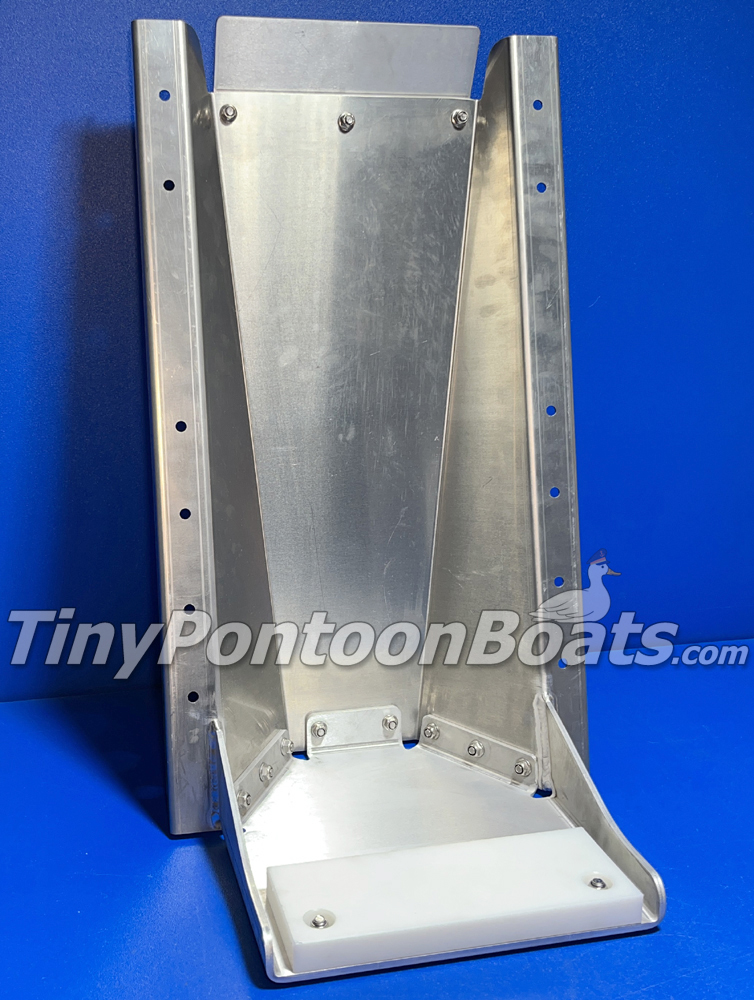 Made for our shorter single-nose boat kits with 27" wide floats (7'x9', 8'x9', 7'x12', and 8'x12' models), this transom is made for long shaft motors and puts the engine clamping plate even with the bottom of the boat's frame. As the center line of the propeller shaft should align with the bottom of the floats on these models, this transom does NOT use a lifted design. This means that if you are using a tiller steer motor (no steering wheel), you will require a tiller steer handle extension to operate your motor. The motor mounting plate has a 14° tilt angle and a HDPE plastic spacer block for clamp-on motors. The motor bracket is made from 5052 and stainless steel installation hardware is included. When purchased with a boat kit, your boat's frame will come with the mounting holes machined to make installation simple.
