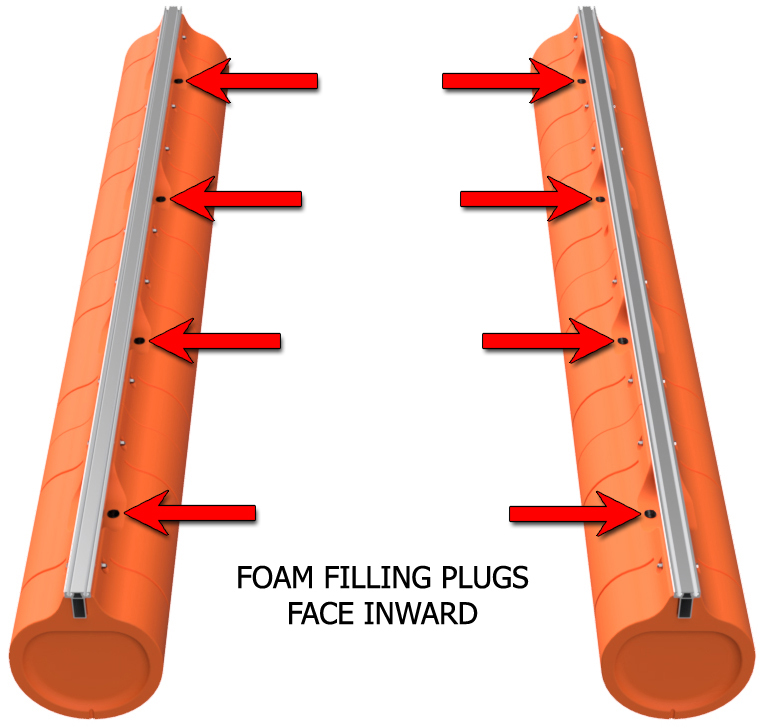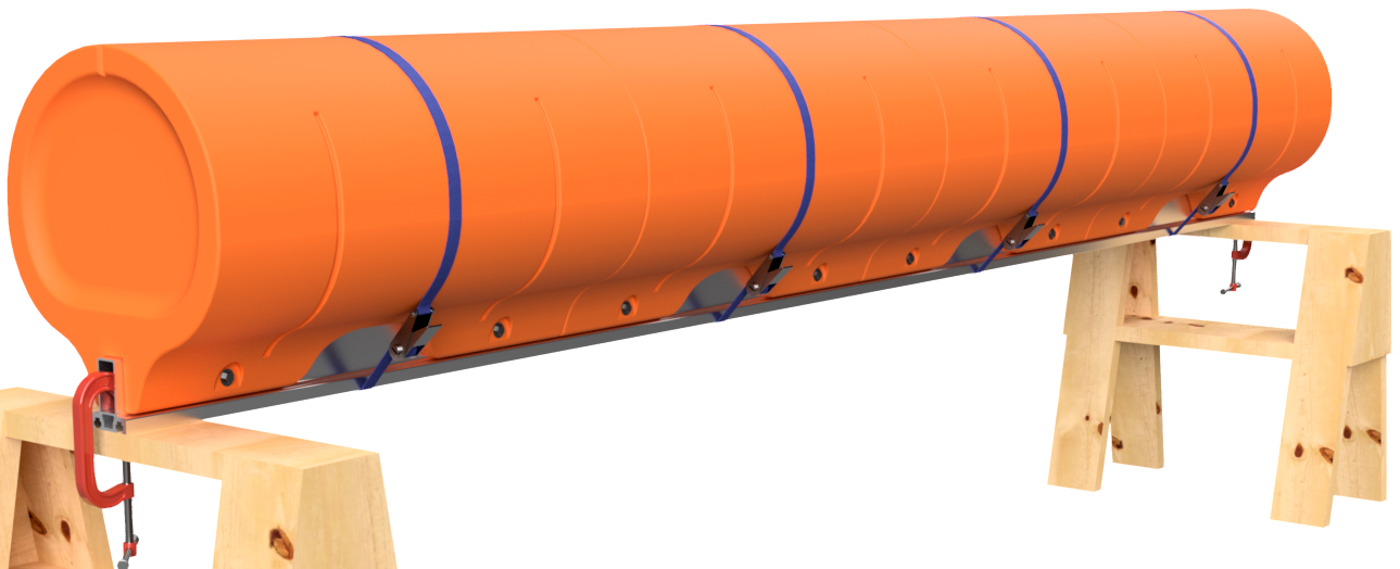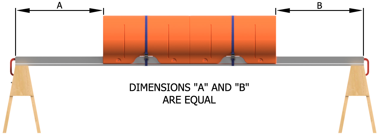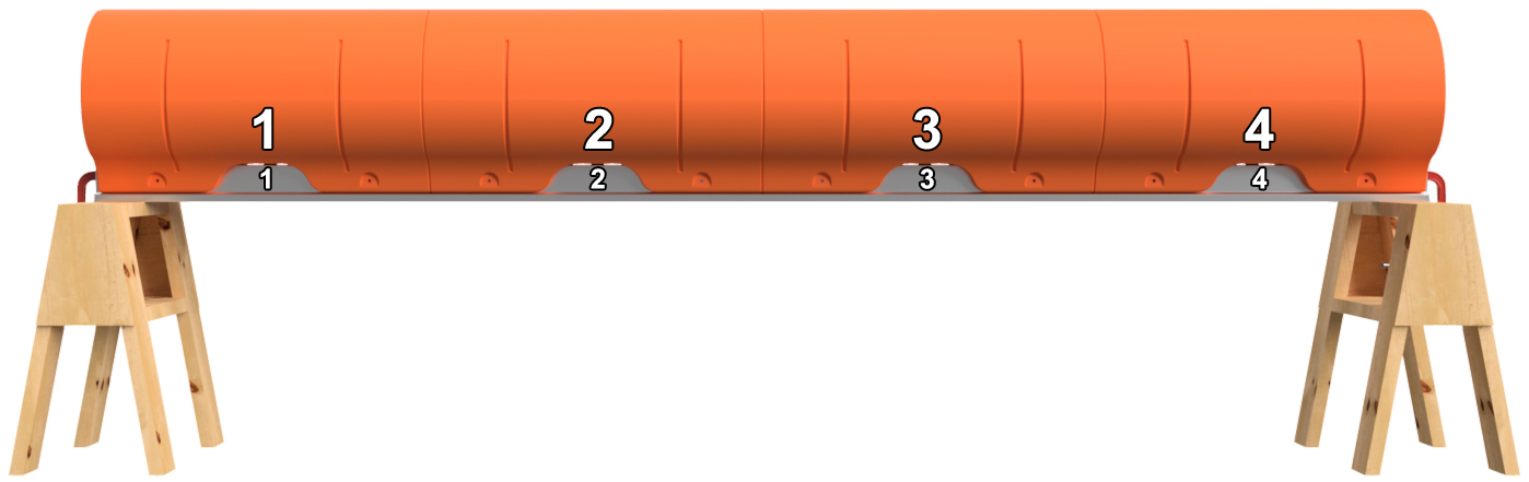 Remove the ratchet straps. Before removing the floats, number the positions of the floats on the main beam as shown. You can use a piece of masking tape to write on or you can use a marker to write on the floats and main beams. If using a marker, lacquer paint thinner will remove the ink after assembly, and the paint thinner will not hurt the plastic or the aluminum. Remove the floats and unclamp the main beams from the saw horses.