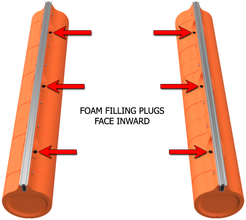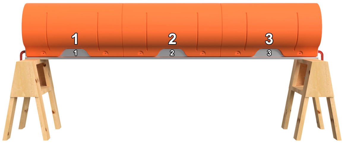 Remove the ratchet straps. Before removing the floats, number the positions of the floats on the main beam as shown. You can use a piece of masking tape to write on or you can use a marker to write on the floats and main beams. If using a marker, lacquer paint thinner will remove the ink after assembly, and the paint thinner will not hurt the plastic or the aluminum. Remove the floats and unclamp the main beams from the saw horses.