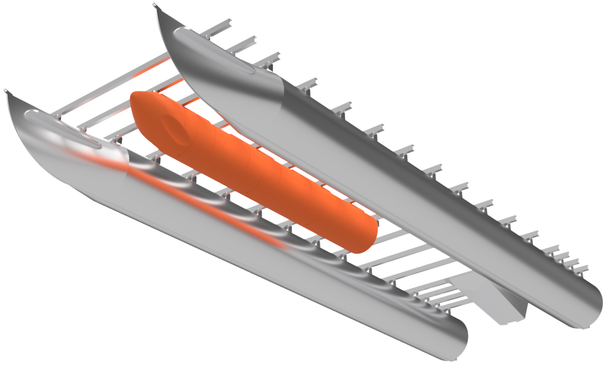 Place a nose cone float on the front of the pontoon assembly as shown. Due to the shape of the nose cone, you will not be able to place a ratchet strap over it.