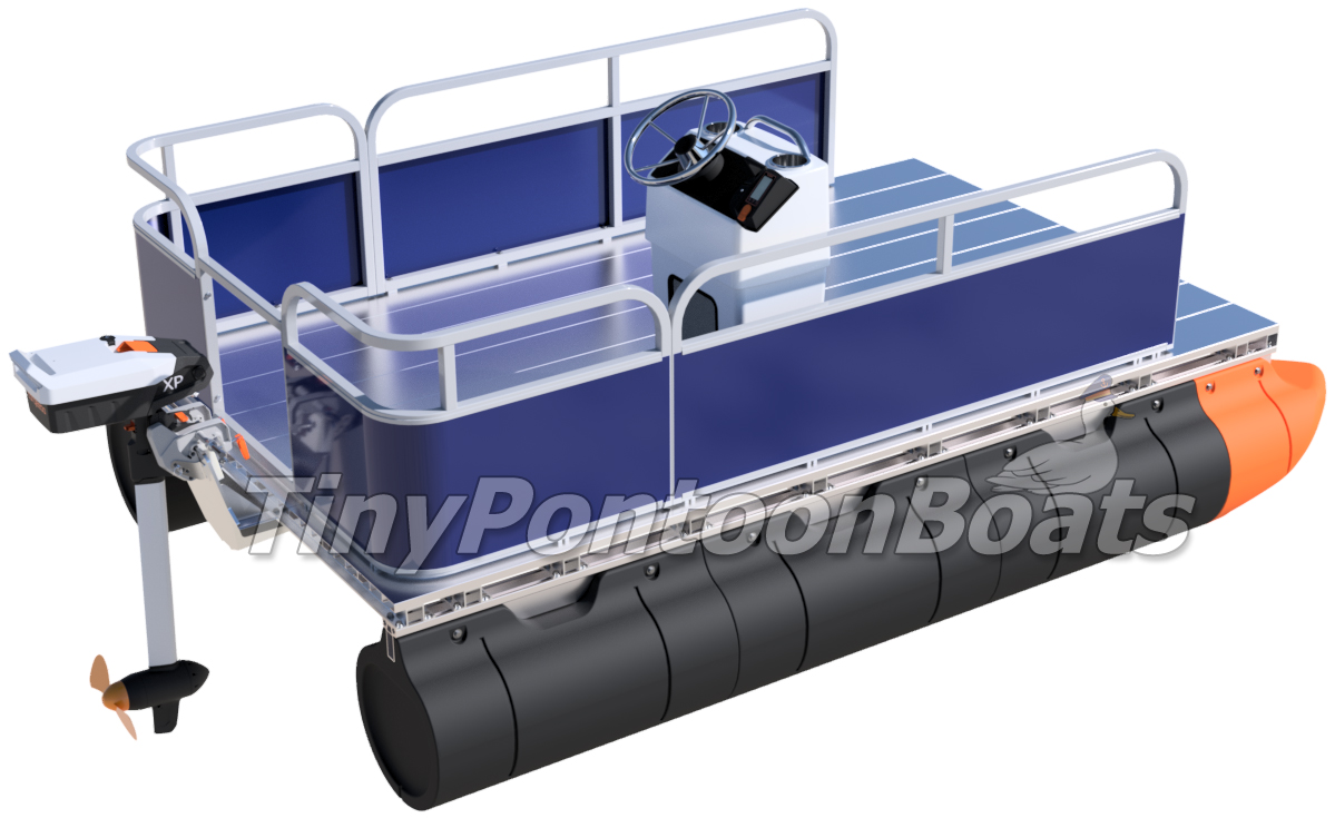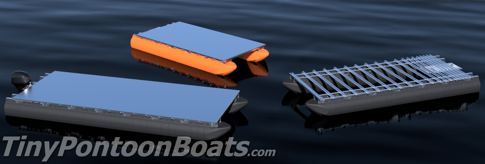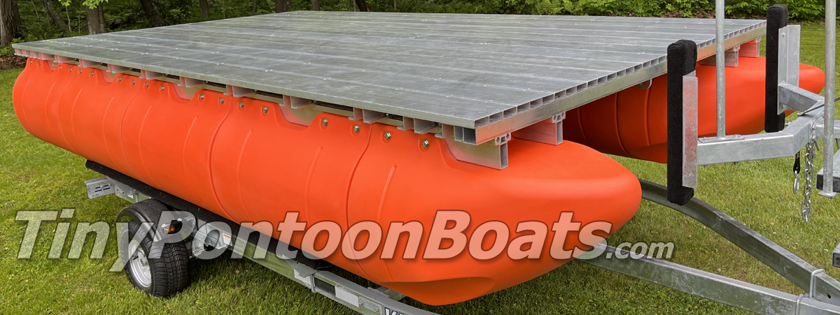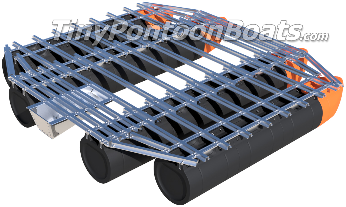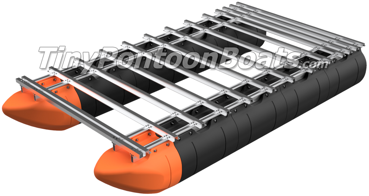 Our 7'x12' and 8'x12' pontoon boat kits are for boaters who need full sized capability in a small package. These kits use our 27" wide floats and have the capacity to get 4 or 5 people onboard. If you expect to do a lot of trailering, we recommend the 7' wide version as it's easy to maneuver at tight boat ramps. If that's not a concern, the 8' wide version is the way to go as it's more boat for the dollar (7' wide boats require additional labor to shorten our standard 8' crossmembers). Both configurations are super stable and provide plenty of room for a great time with friends and family. We offer this kit with or without our aluminum decking package, have multiple transom options, fence packages, and other bolt-on items. Please visit our accessories page to see the full list of add-ons we offer for our boat kits. Our 7'x12' and 8'x12' mini pontoon boat kits are available with black and orange floats.