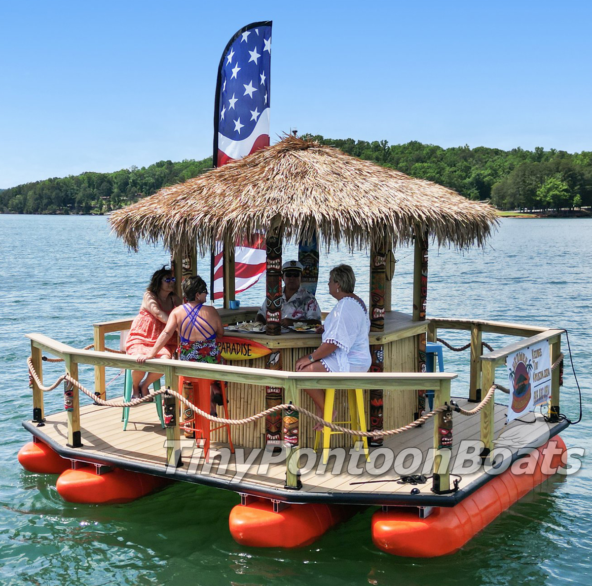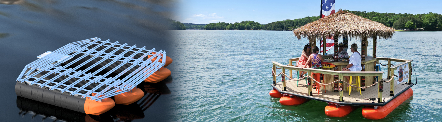 Our 15'x15' Flying Octagon is our large bolt-together tiki boat base. This is a puropose-designed octagonal barge kit that is made for you to build your floating lounge for friends and family to enjoy. This kit includes our 30 HP capacity transom and has four rows of 27" wide floats. Due to the complexity of this kit, and the typical desired aestetic of the finished craft, we DO NOT offer an aluminum decking package or railing system for this kit. Our 15'x15' tiki boat base is available with black and orange floats. This kit typically has a 1-4 week lead time and shipping IS NOT included in our price. Please inquire for a freight quote.