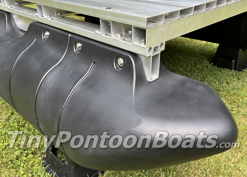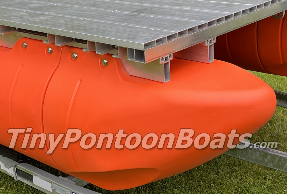 Our 6'x11' mini pontoon boat kit is the sweet spot for recreational customers who want a small boat, especially for electric-only ponds and lakes. This is the most popular of our small boat kits and it uses our 18" diameter floats that keep you low to the water. This kit provides a 72"x122" platform, which is plenty of room to fish from, and one of these kits can be bolted together in a few hours. This little boat is easy to transport as it only weighs 504 pounds (with aluminum decking package installed), and it has the capacity for two people, a dog, and a cooler. We offer this kit with or without aluminum deck planks, and also offer optional transoms, fence packages, and other bolt-on items. Please visit our accessories page to see the full list of add-ons we offer for our boat kits. Our 6'x11' mini pontoon boat kit is available with black and orange floats.