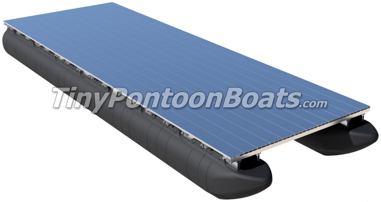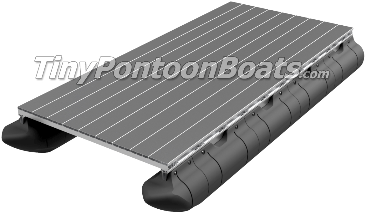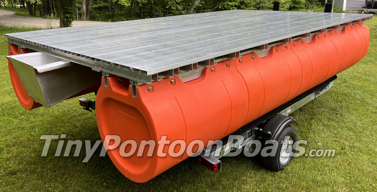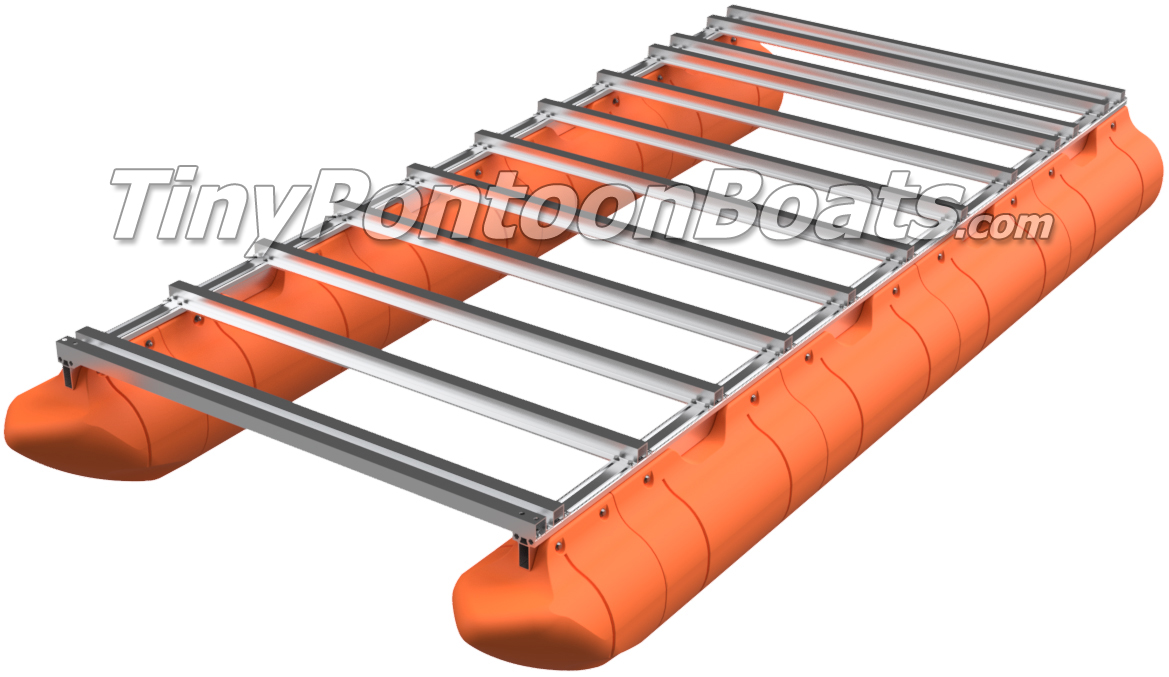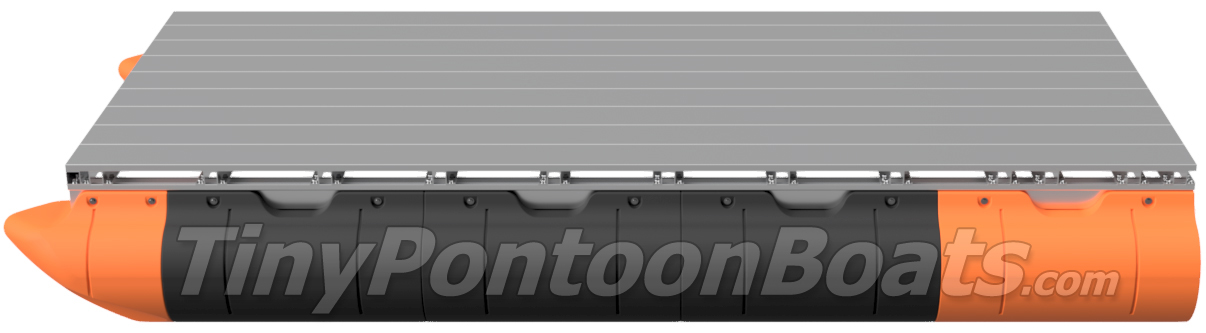 Our 6'x14' mini pontoon boat kit is the largest we offer with 18" floats. It has a low deck height and capacity to get three folks, a dog, and a cooler out on the water. These also work great for small research vessels or mini work platforms. This kit provides a 72"x158" platform, which is quite a bit of space, and one of these kits can be bolted together in a weekend. Weighing only 651 pounds (with aluminum decking package installed), it's also easy to transport. We offer this kit with or without aluminum deck planks, and also offer optional transoms, fence packages, and other bolt-on items. Please visit our accessories page to see the full list of add-ons we offer for our boat kits. Our 6'x14' mini pontoon boat kit is available with black and orange floats.
