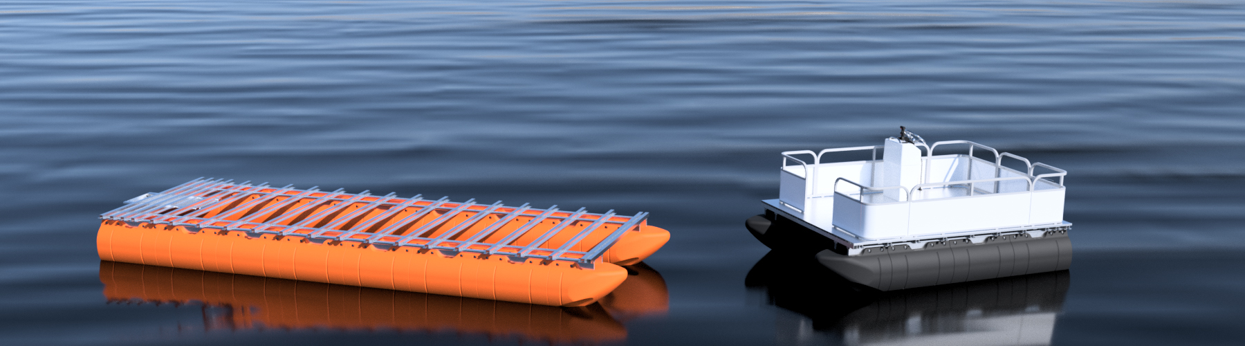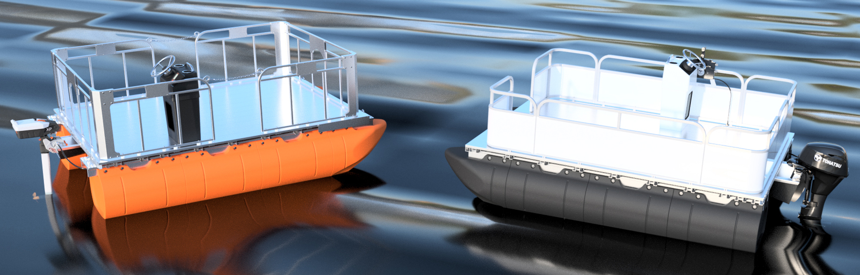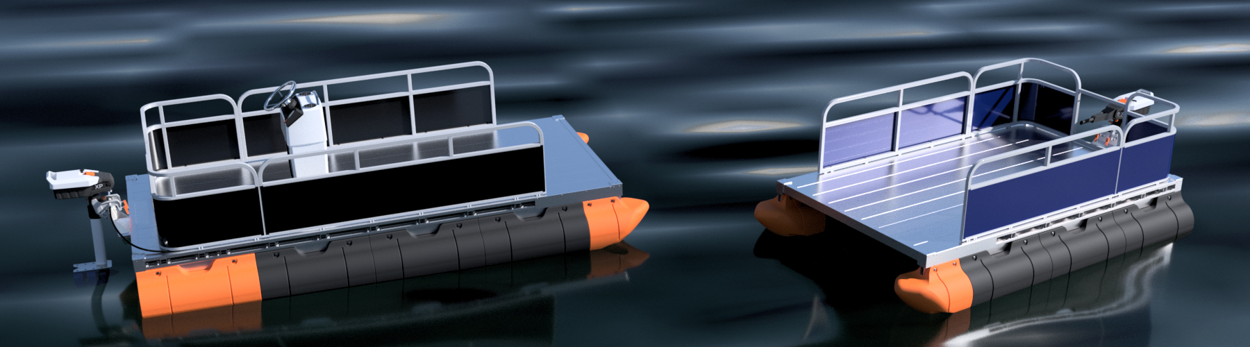 Our 6'x14' mini pontoon boat kit is the largest we offer with 18" floats. It has a low deck height and capacity to get three folks, a dog, and a cooler out on the water. These also work great for small research vessels or mini work platforms. This kit provides a 72"x158" platform, which is quite a bit of space, and one of these kits can be bolted together in a weekend. Weighing only 651 pounds (with aluminum decking package installed), it's also easy to transport. We offer this kit with or without aluminum deck planks, and also offer optional transoms, fence packages, and other bolt-on items. Please visit our accessories page to see the full list of add-ons we offer for our boat kits. Our 6'x14' mini pontoon boat kit is available with black and orange floats.