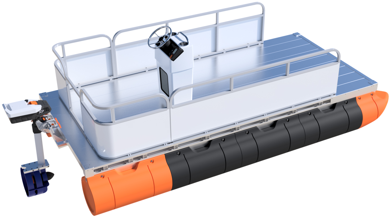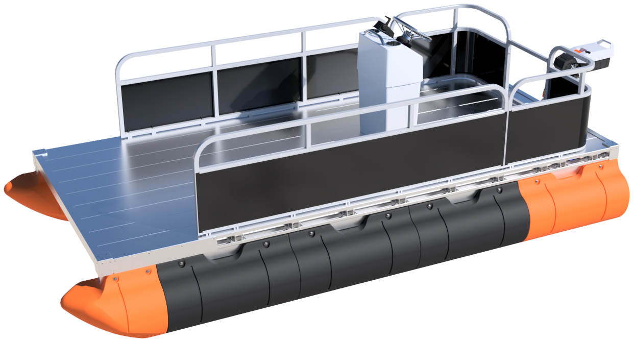 8'x15' pontoon boat kits are full-sized boats with full-size capacities. These kits use our 27" wide floats and have capacity to get 5 or 6 people on the water. This size pontoon boat is super stable and offers a ton of room to fish from and cruise with your friends and family. We offer this kit with or without an aluminum decking package, have multiple transom options, fence packages, and other bolt-on items. Please visit our accessories page to see the full list of add-ons we offer for our boat kits. Our 8'x15' mini pontoon boat kits are available with black and orange floats.