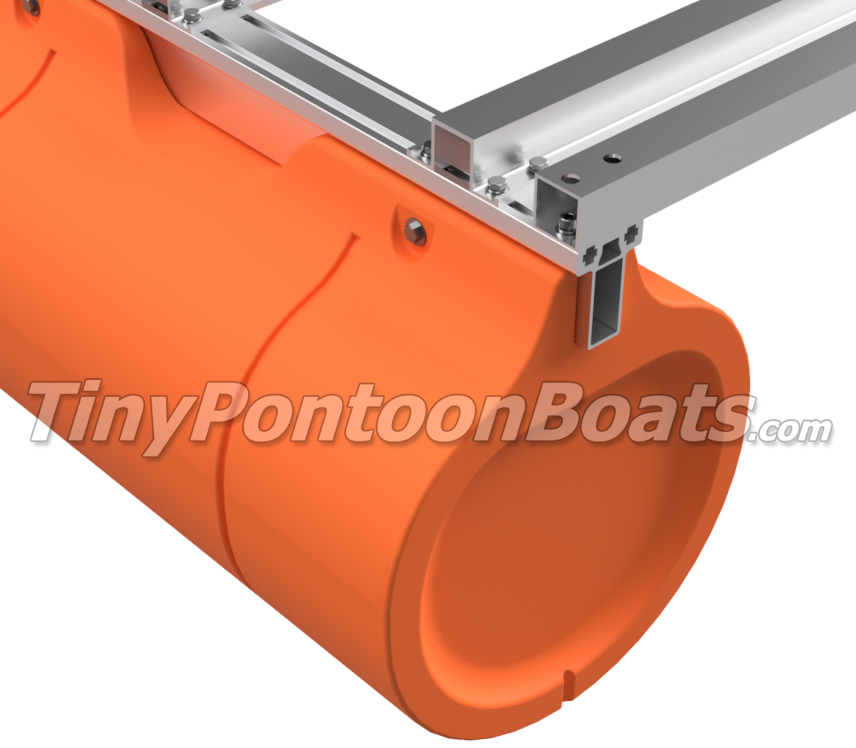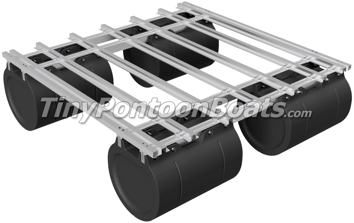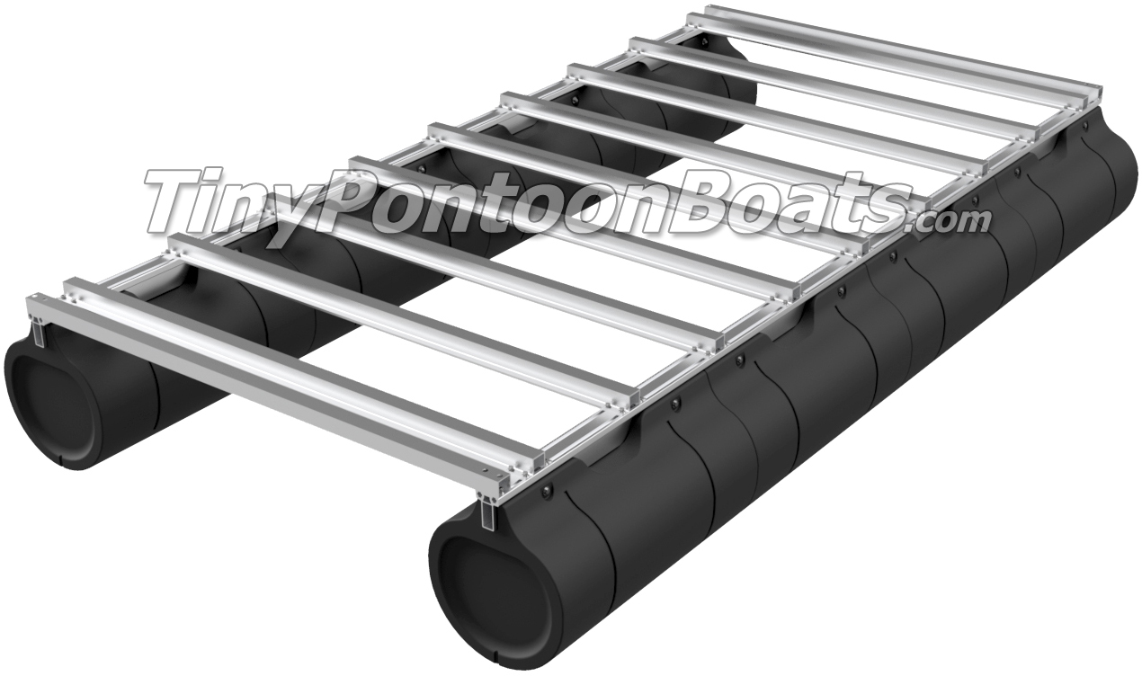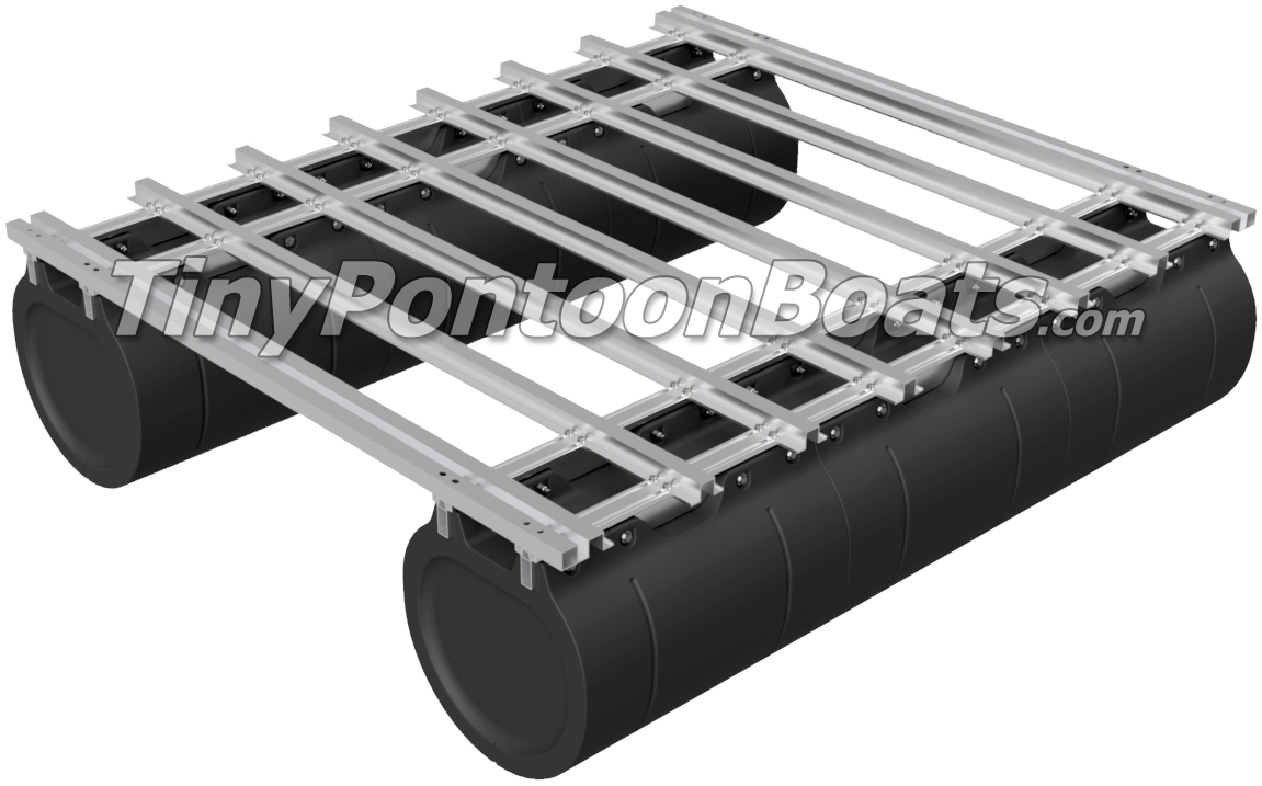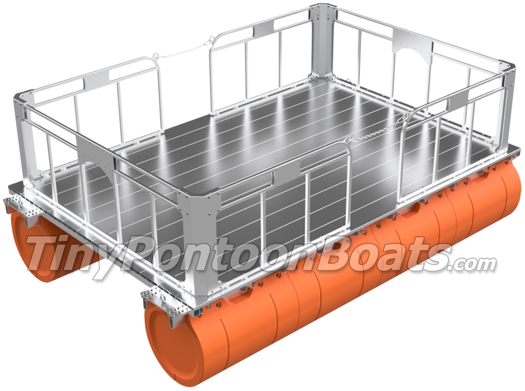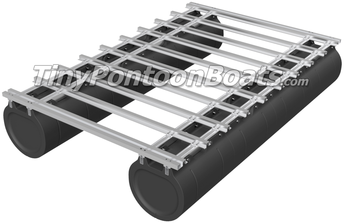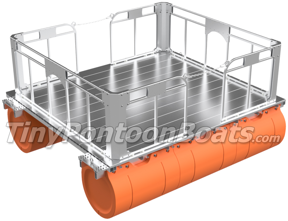 Our 8'x12' blunt pontoon work platform kit uses our 27" wide floats and provides full-size capability. If you need to get the whole crew out on the water to get work done, or have heavy equipment to float, this mini work barge gets it done. Best of all, it fits on a standard pontoon boat trailer and is easy to assemble.