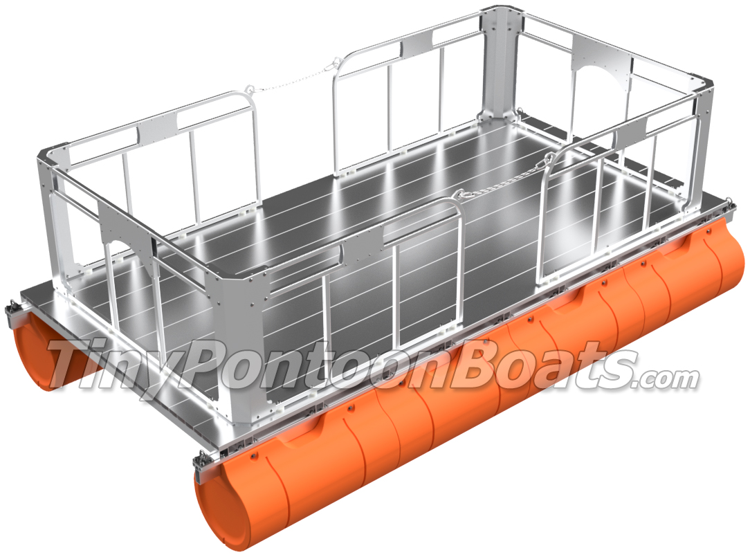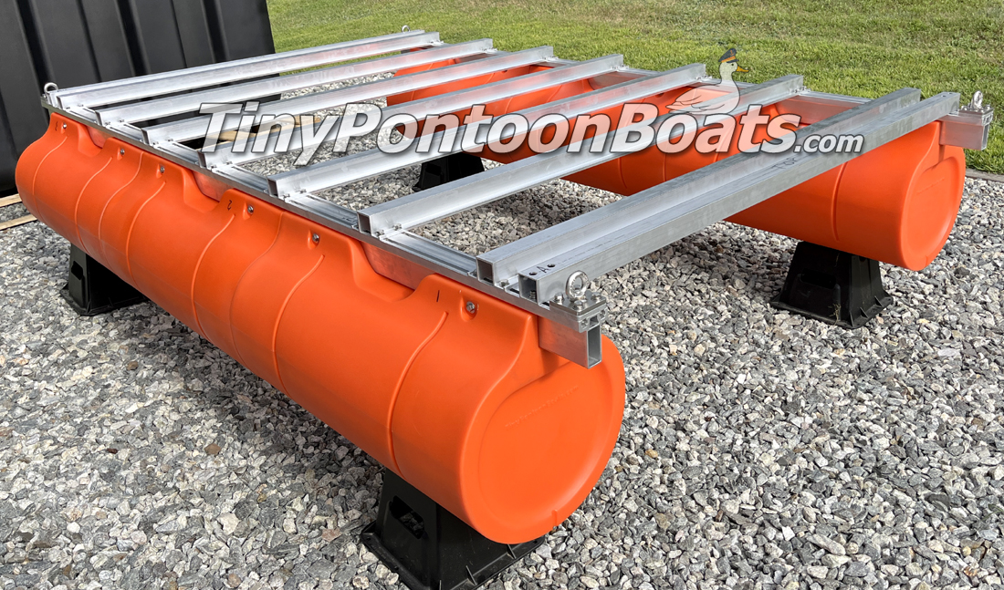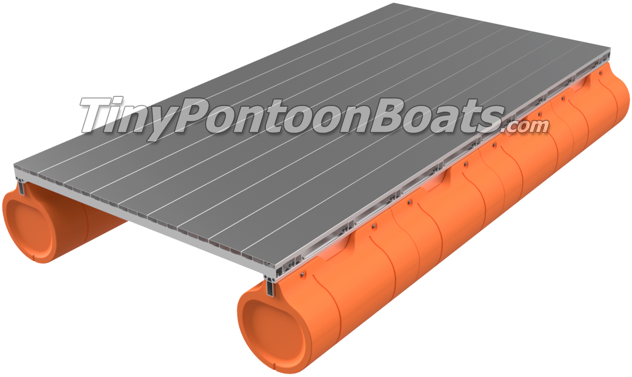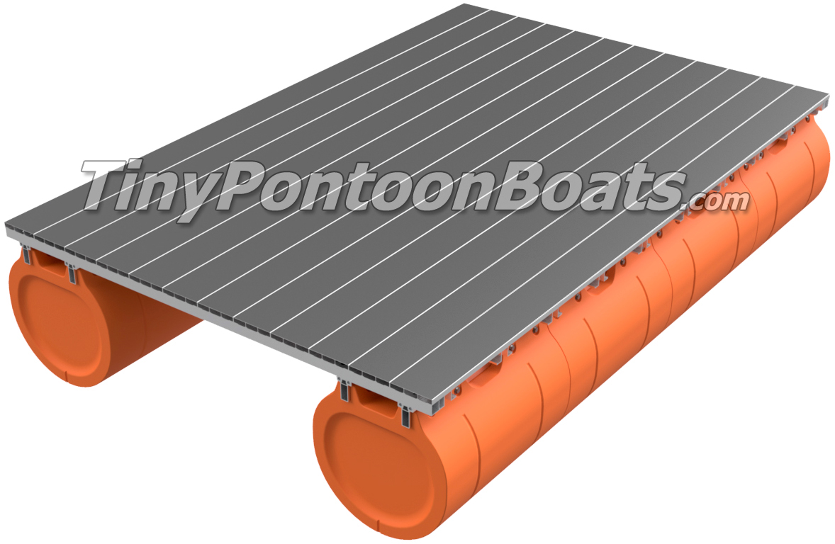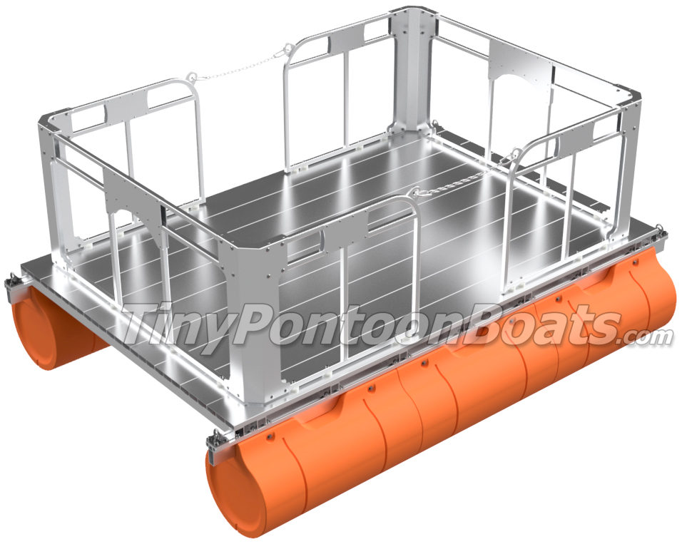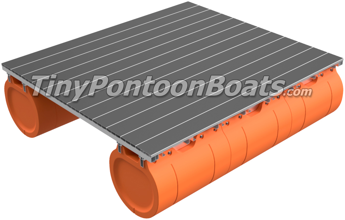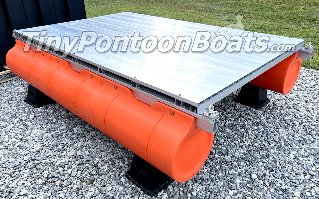With our aluminum decking package, this small raft weighs in at a manageable 608 pounds and has a capacity of 956 pounds (rated at half submersion of the floats). Our kit comes with all the required hardware, is available with or without aluminum decking, and we have super thorough assembly instructions here on our website. These kits are available with black and orange floats. This kit typically has a 1-3 week lead time and shipping IS NOT included in our price. Please ask for a freight quote before placing your order.
